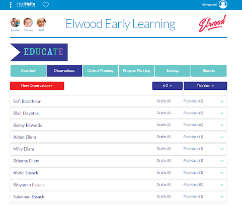 The Observation tab is where new observations can be created and also where draft or published observations can be viewed. Observations can be recorded for individual children, a group of children or all children assigned to a particular room.